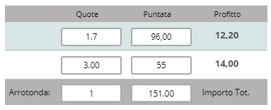 - Puntata: variando la singola puntata cambia l’Importo Totale e il profitto € corrispondente.